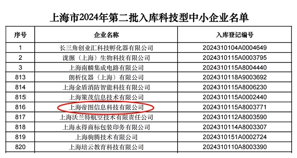 9月5日,上海科學(xué)技術(shù)委員會發(fā)布的《上海市2024年第二批入庫科技型中小企業(yè)名單》,上海帝圖信息科技有限公司再次上榜!